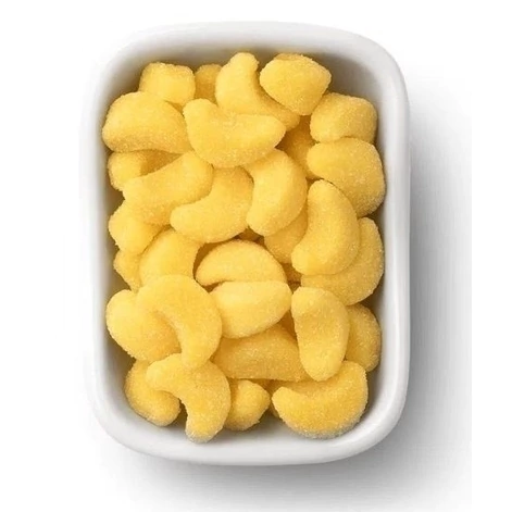 Ingredientes: Xarope de glicose, açúcar, água, gelificante gelatina, acidulante ácido cítrico, corante inorgânico dióxido de titânio, aromatizante e corante artificial tartrazina. Não contém glutén.