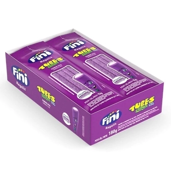 Tubes Uva Azedinho Fini, o primeiro Tubes Uva do Brasil. Azedinhos, cumpridinhos e saborosos e possuem formato de tubo. No pacote contém tubes na cor roxo com sabor de uva e acabamento cítrico.
