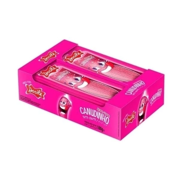O sabor consagrado do tutti-frutti com um toque azedinho! Incrivelmente delicioso esse Canudinho. O Canudinho é um doce lindo e muito saboroso! É cumpridinho e recheado, à base de açúcar, glicose e farinha de trigo, já o recheio é feito com gelatina e amido de milho.