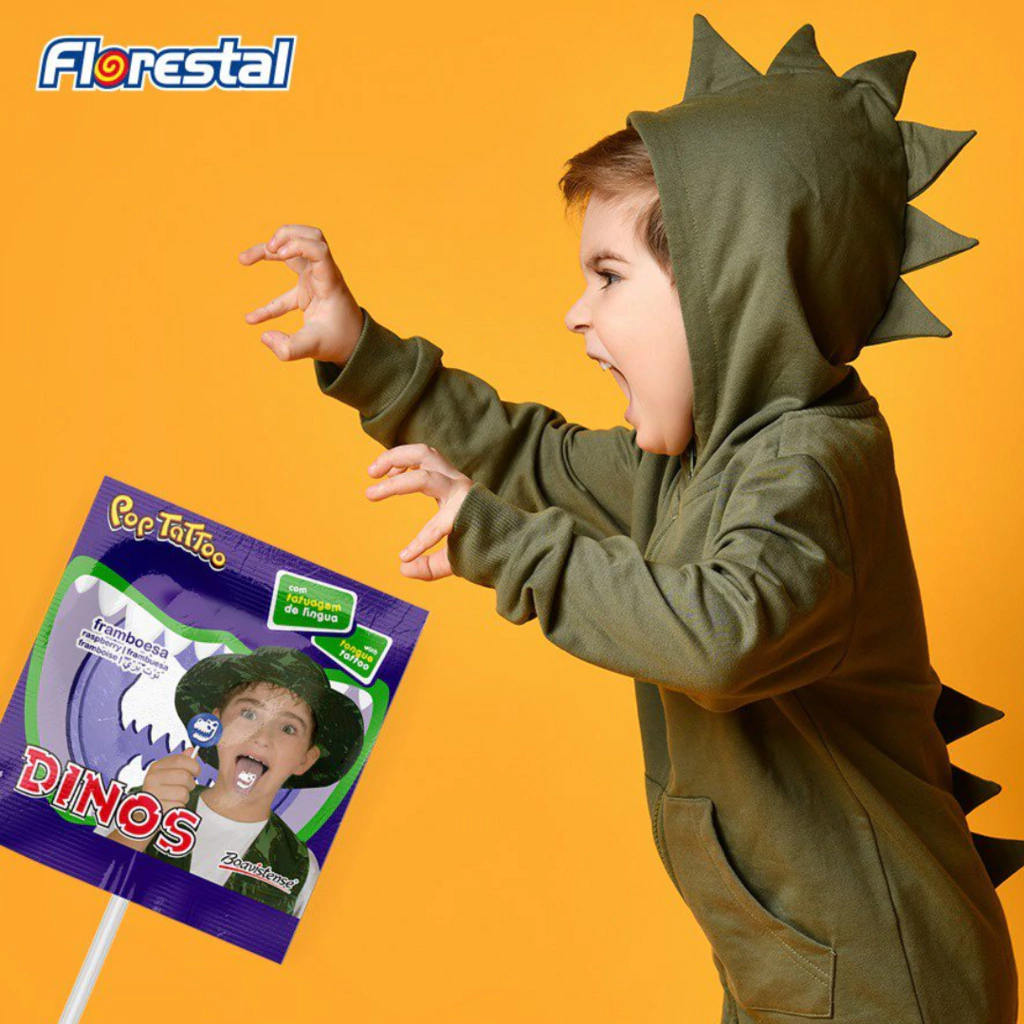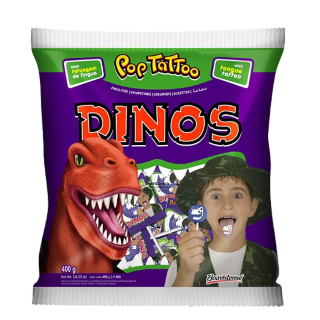 Como novidade no pirulito Framboesa Dinos há uma tatuagem de língua, que basta segura-la sobre a língua e pronto, tatuado! Mas não se preocupe, ela sai facilmente após escovar seus dentes e boca como de costume. Use para distribuir às crianças que lhe visitam e perguntam "Doçuras ou Travessuras".