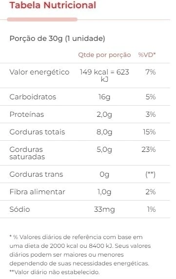 Ingredientes: açúcar, leite em pó integral, manteiga de cacau, farinha de trigo enriquecida com ferro e ácido fólico, biscoito, gordura vegetal, cacau em pó, maltodextrina, soro de leite em pó, sal, óleo vegetal de palma, emulsificantes (lecitina de soja e poliglicerol polirricinoleato), corante caramelo IV e aromatizante. Alérgicos: contém leite e derivados, derivados de trigo e derivados de soja. Pode conter avelãs, amendoim, nozes, castanha-do-pará, castanha-de-caju, cevada, aveia, centeio e látex natural. Contém lactose. Contém glúten.